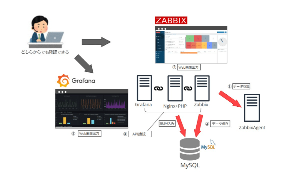 - GrafanaがZabbixServerとAPIで接続してデータを収集