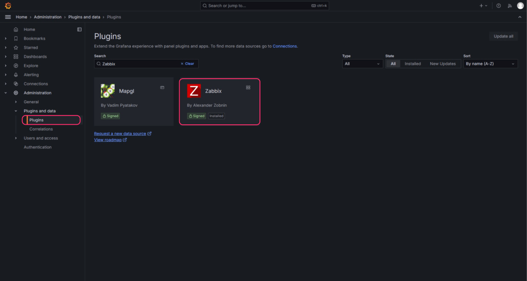 では、実際に設定していきます。「Administration」⇒「Plugins and data」⇒「Plugins」検索欄でZabbixを検索して表示されたら押下しましょう。