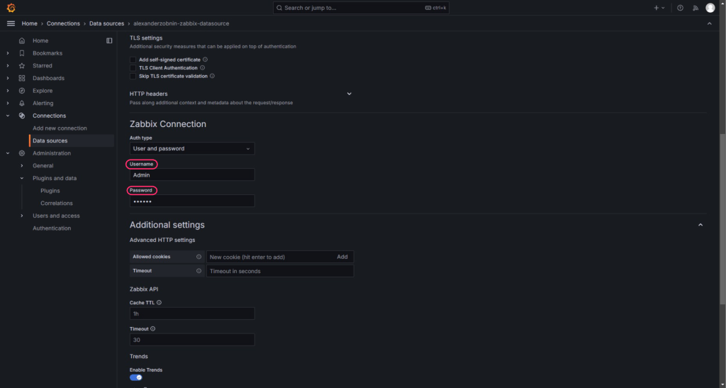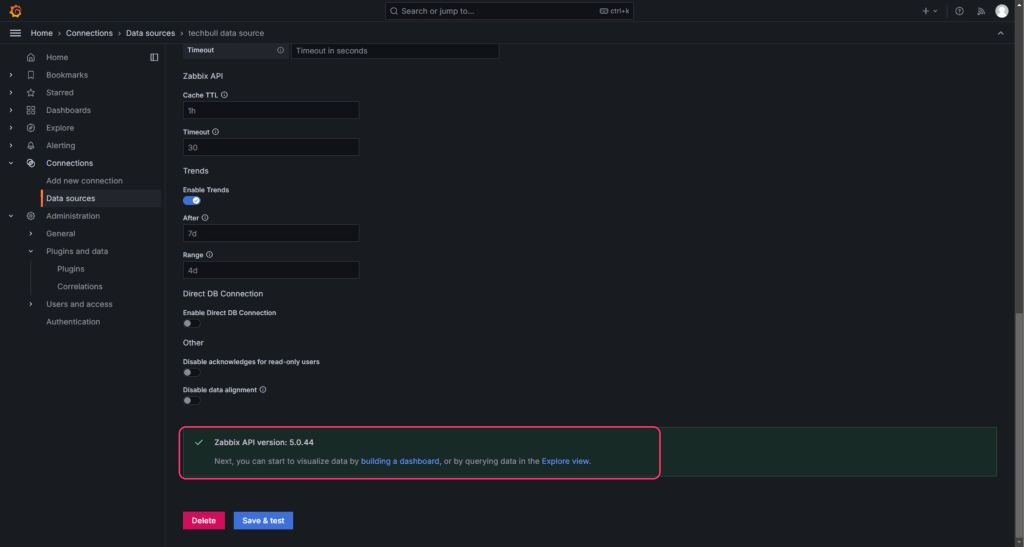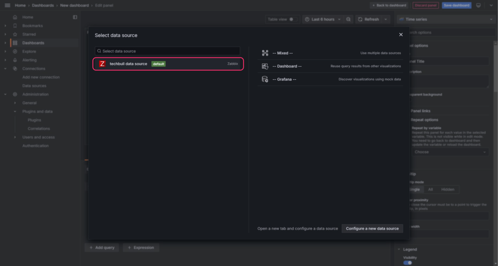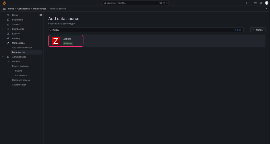 次にデータソースとしてZabbixを設定、「Connections」⇒「Data sources」でZabbixを検索します。