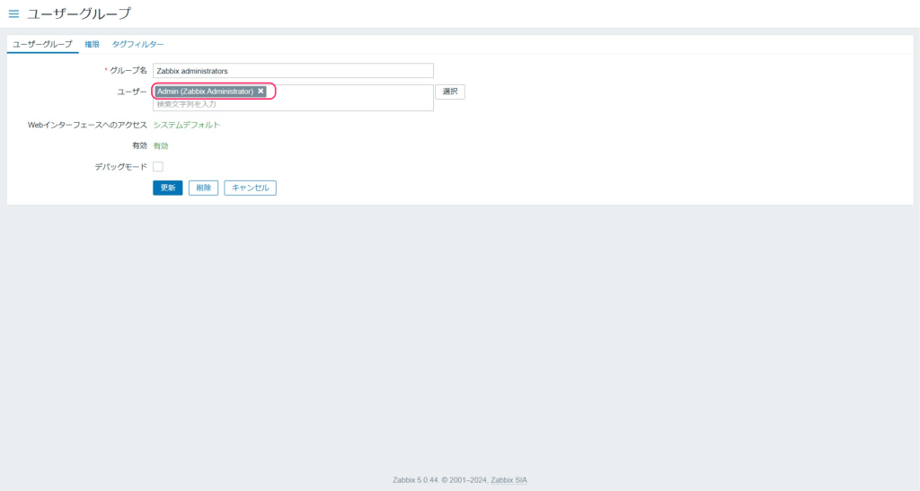 「管理」⇒「ユーザーグループ」からZabbix administratorsを押下ない場合は作成しましょう。以下のようにユーザーにAdminが選択されていればOKです。