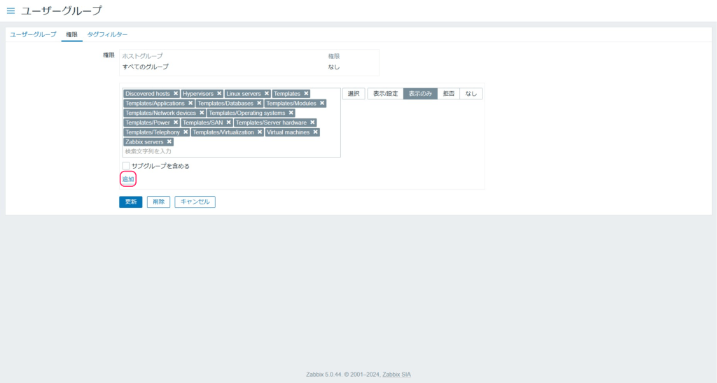 次に権限タブに移動して「選択」を押下後すべてのグループを投入しましょう。今回の権限は「表示のみ」を設定します。その後、追加をクリック