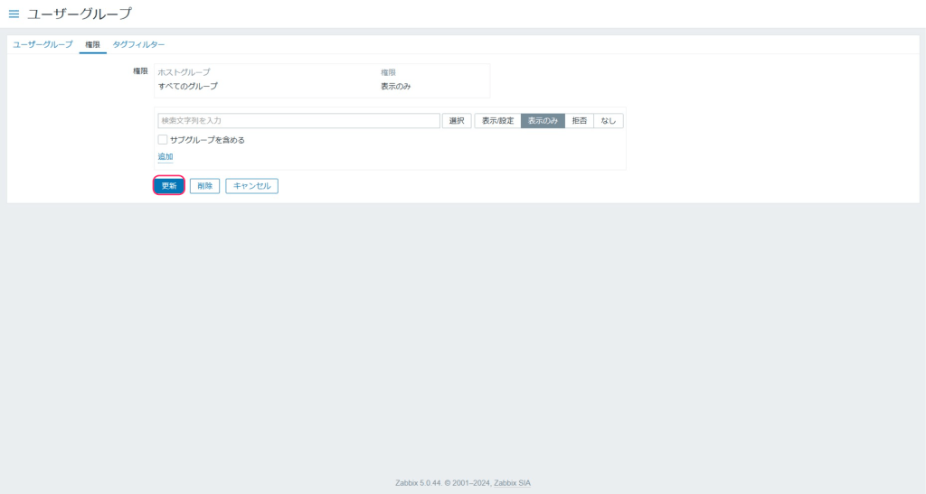 そもそもなんでユーザーグループを設定するのかという話なのですが、こちらの閲覧権限を設定することでAPIユーザー(Grafana)がホストグループのデータを閲覧できるようになるためです。
