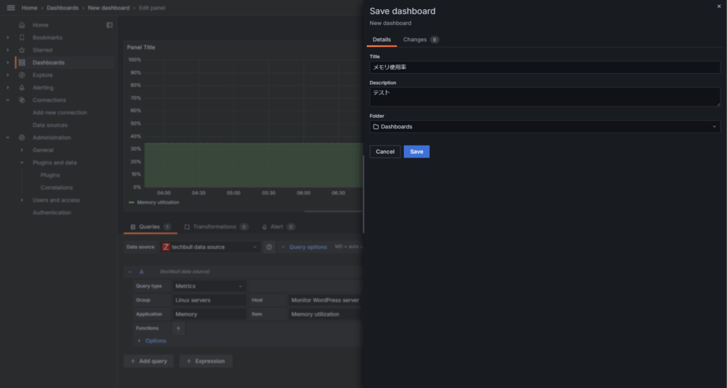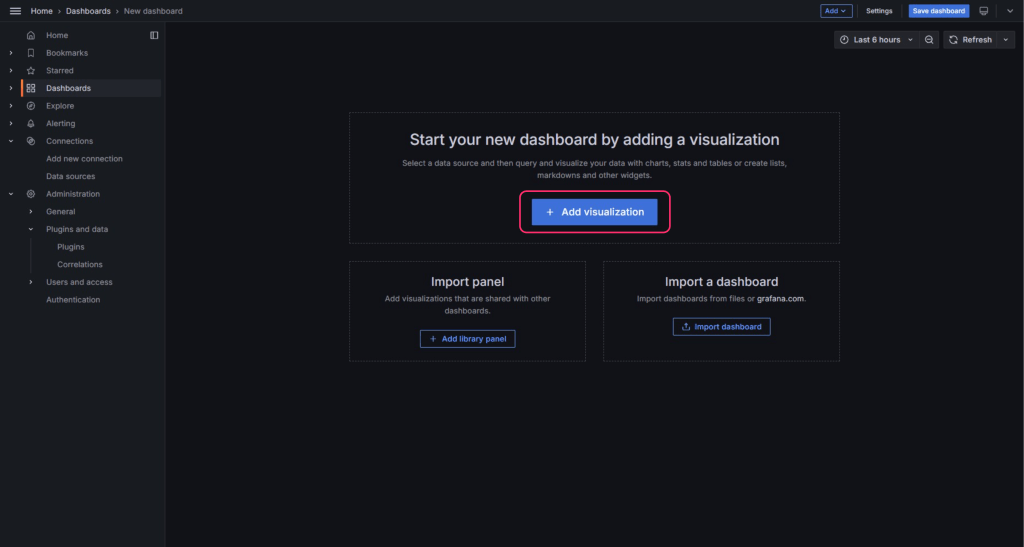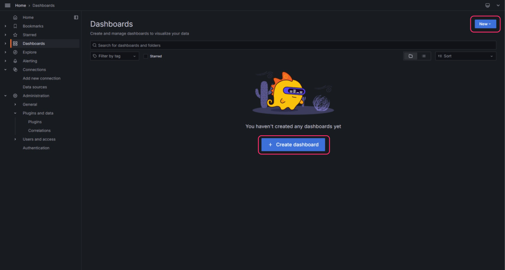 それでは、Grafanaに戻ってダッシュボードの作成を行っていきます。「Dashboards」から「Create dashboard」または「New」をクリック
