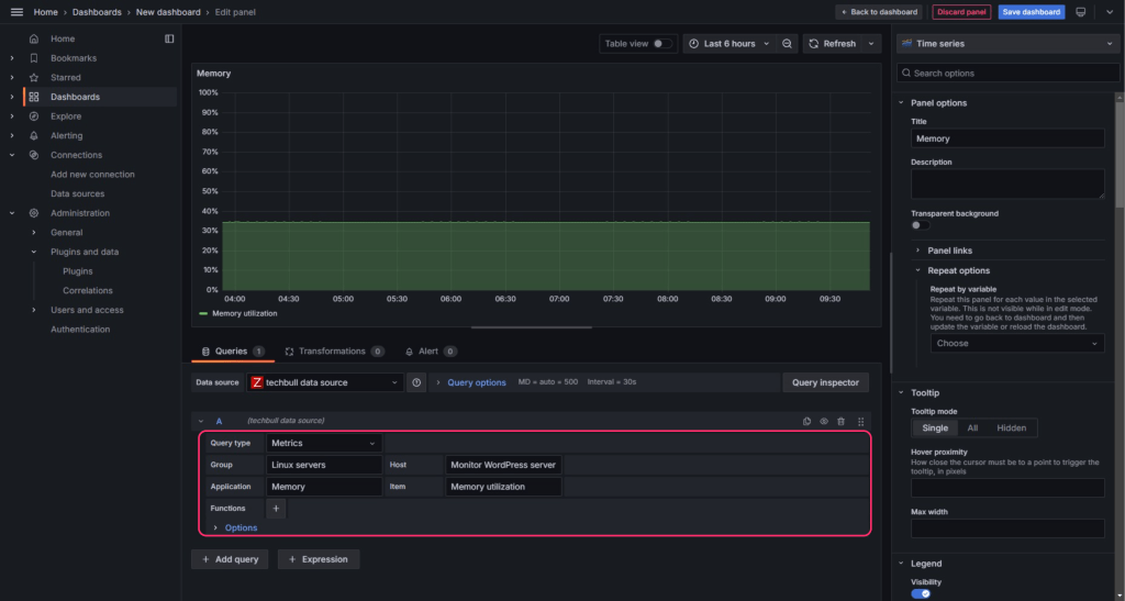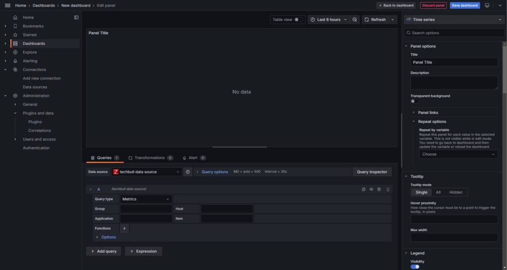 それでは、実際に設定してZabbixからのデータを取得しましょう。Query type、Group、Host 、Application、itemを設定します。右のサイドバーでは、グラフの細かなレイアウトを設定することが可能です。
