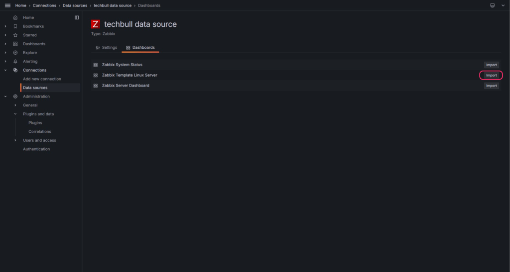 今回は、ダッシュボードを新規で作成したのですが、ダッシュボードのテンプレートが用意されておりこちらを利用して作成することも可能です。「Data sources」⇒「Zabbixのデータソース名」⇒「Dashboards」タブ