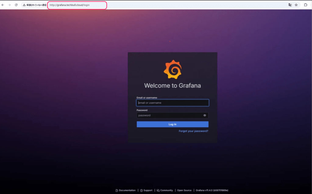 NginxのバックエンドのGrafanaに対してのリクエストに関する設定を追記しています。また、http://localhost:3000でGrafanaのコンソールへ接続していたものが、http://grafana.techbull.cloudでの接続が可能となります。