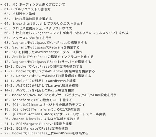 TechBullでは、実務に即した課題を通じてインフラ技術を現場レベルで学ぶことができます。例えば、以下のような課題の内容が用意されています。GitHubでチーム開発や、サーバの基礎知識から監視/モニタリング、IaC、コンテナ、AWSでのWebシステム構築、CI/CD、プログラミングなど、幅広く学べることができます。