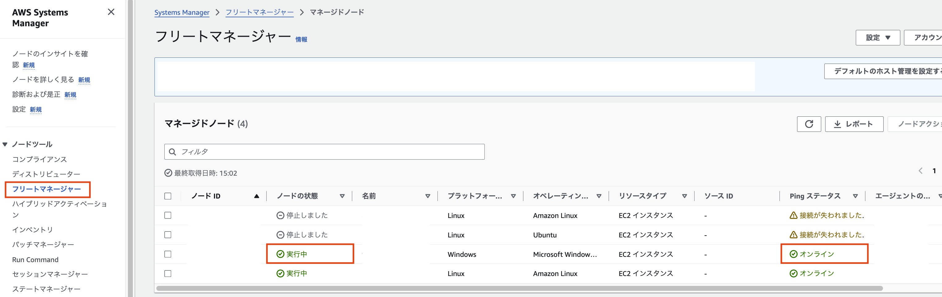- マネージドノードの一覧で対象のサーバが以下の状態であることを確認します。
