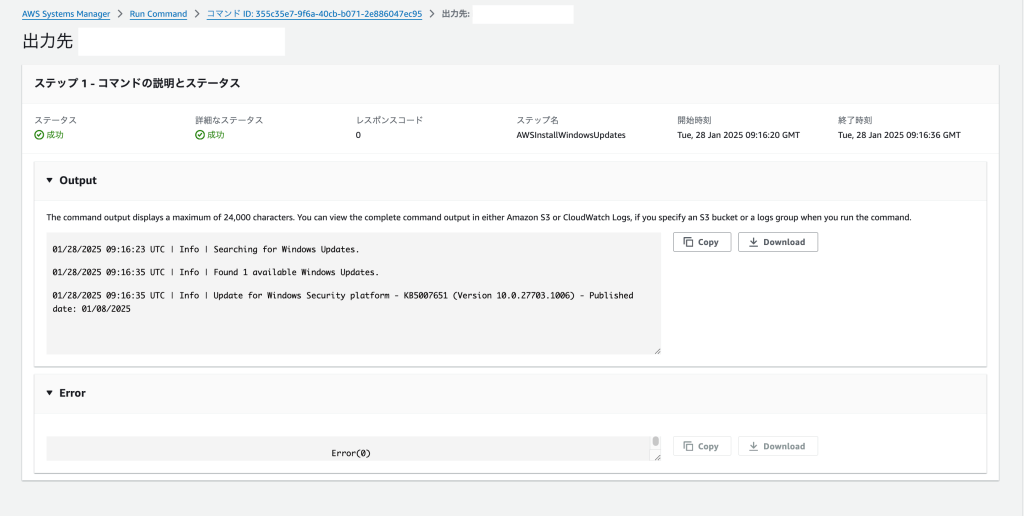 - 「Output」でWindows Updateが実行されたこと確認できます。