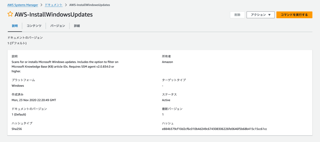 - 「AWS-FindWindowsUpdates」を検索し、対象のリンクを押下し「コマンドを実行する」を押下します。