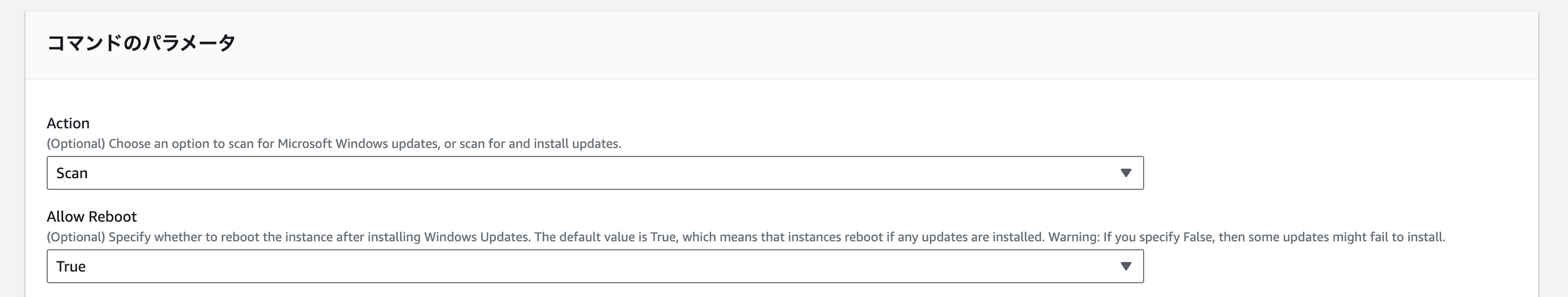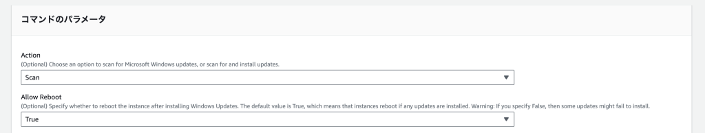 今回はすべてのUpdate情報を確認するだけですのでActionはScanとしAllow RebootはFalseとします。Action Scan Allow Reboot False - ターゲットは「インスタンスを手動で選択する」を選択します。