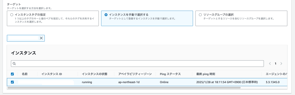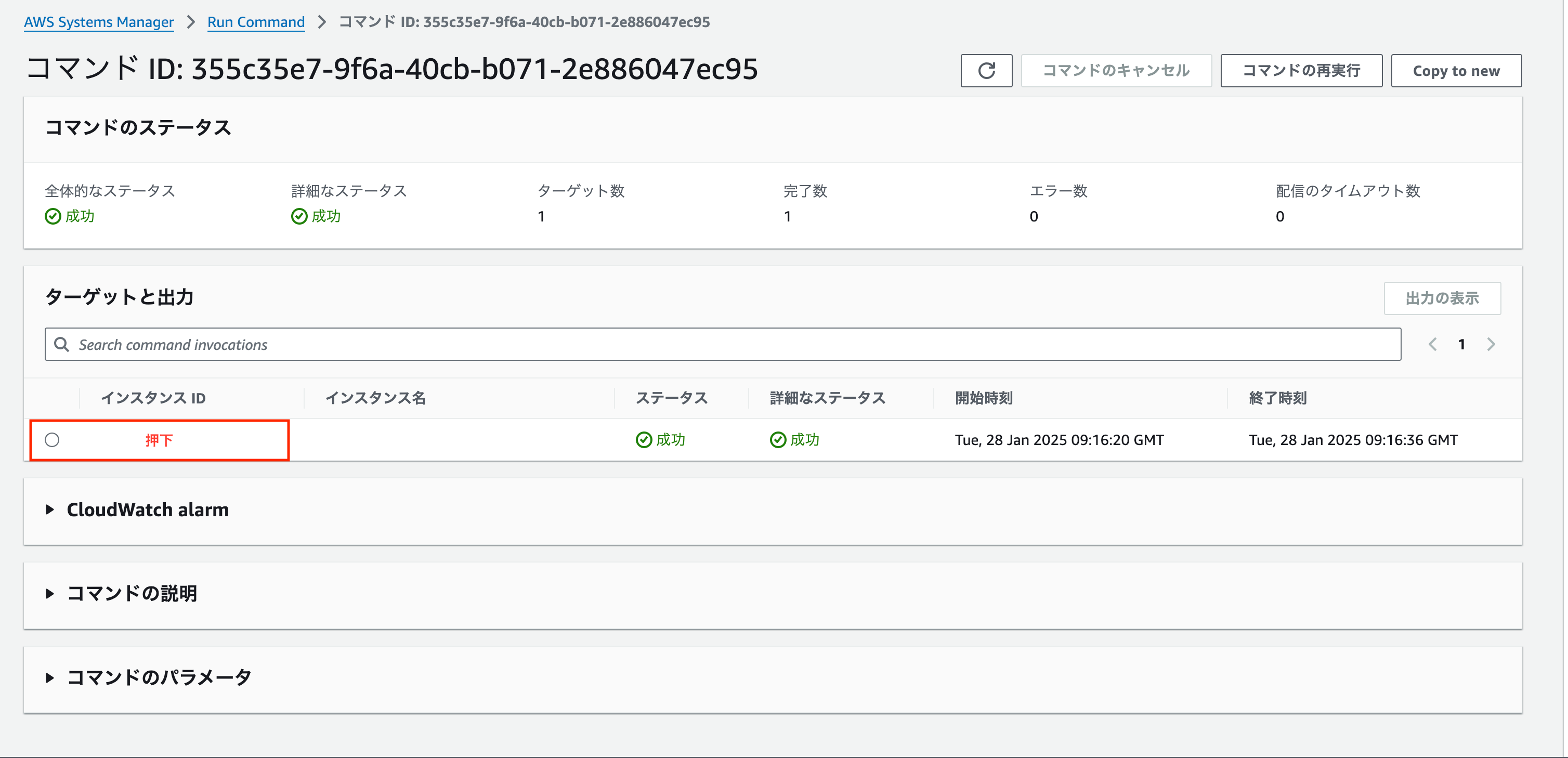- コマンドのステータスに「成功」と表示された後、対象のインスタンスを押下します。