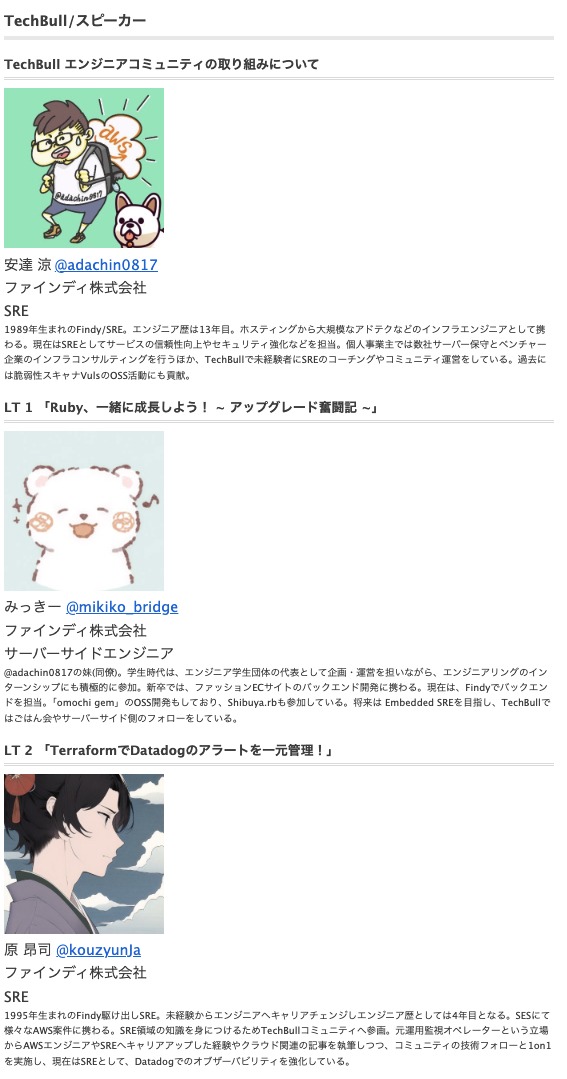 TechBullは、ジュニアエンジニアの成長を支援することを目的としたエンジニアコミュニティです。SREの @adachin0817 さんが中心となって、駆け出しエンジニア向けのTechブログ、メンタリング、そして今回初!LT大会を開催します!