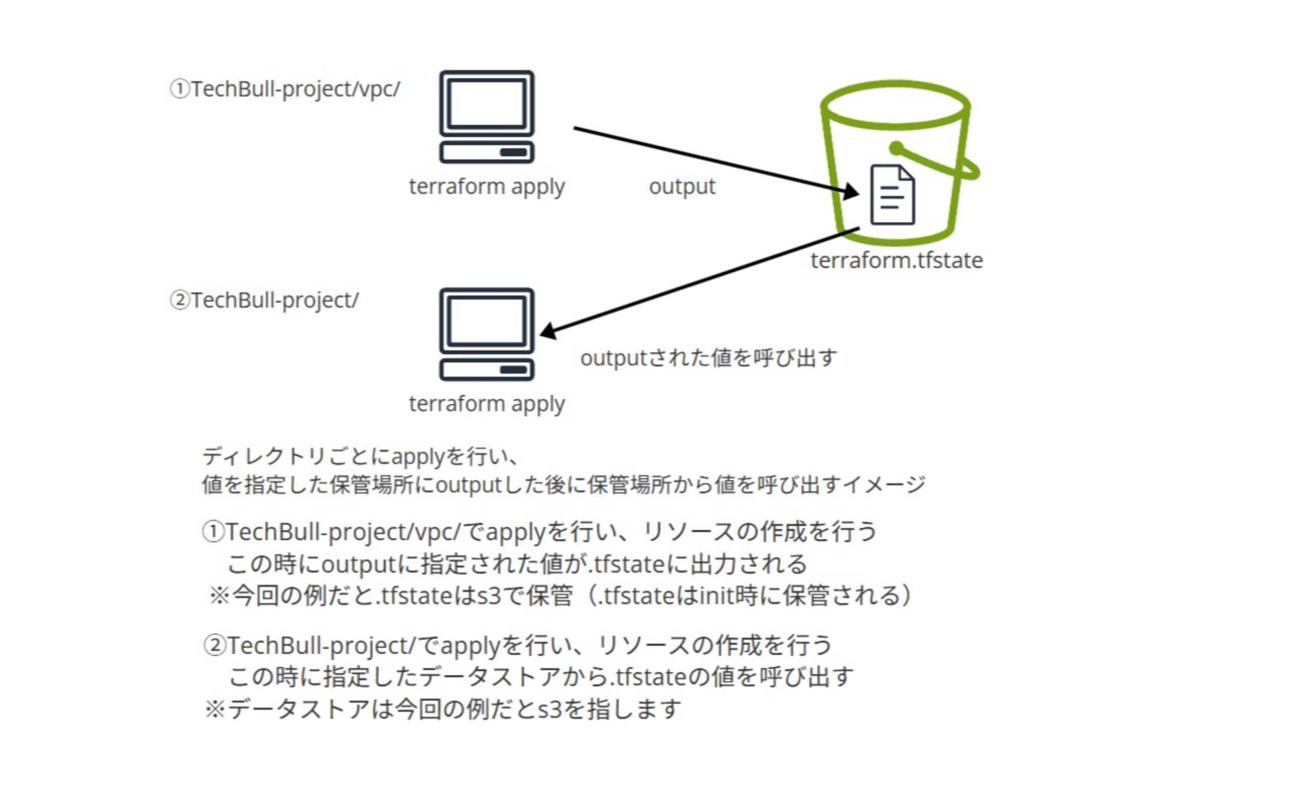 Terraformはapply時にデフォルトではローカルに保存されているterraform.tfstateに保存されます。s3などのterraform.tfstateをリモート管理している場合はremote_stateで情報を取得することができます。