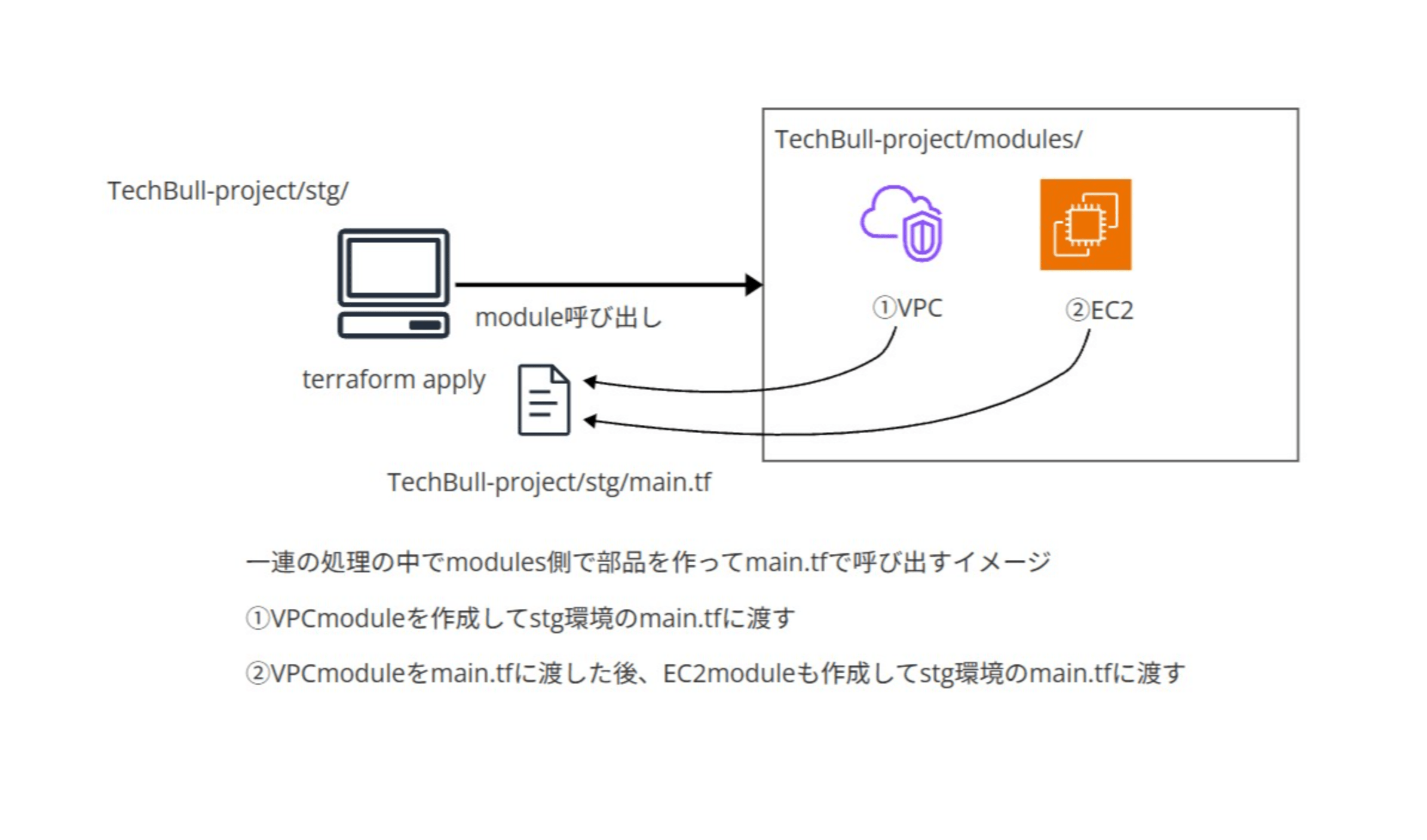 Terraformはルートモジュール(カレントディレクトリ)の.tfファイルをに記述された内容を基に処理を実行します。