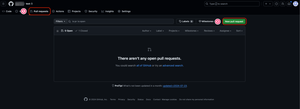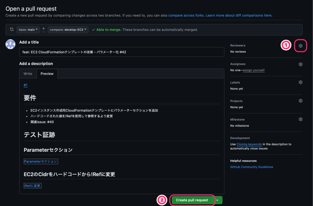 ②をクリックするとプルリクエストの画面に遷移