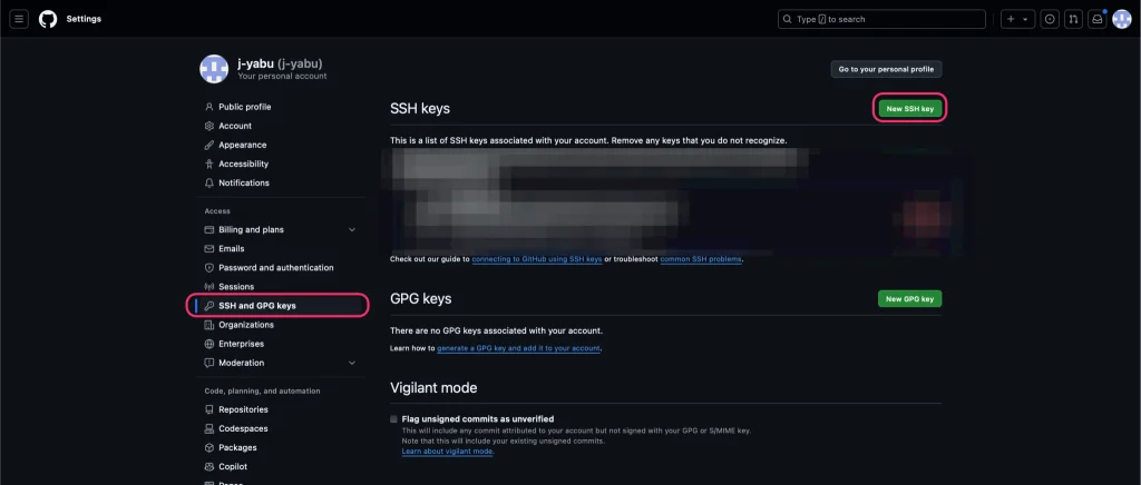 - 左側のメニューから「SSH and GPG keys」をクリックしNEW SSH Keyを選択