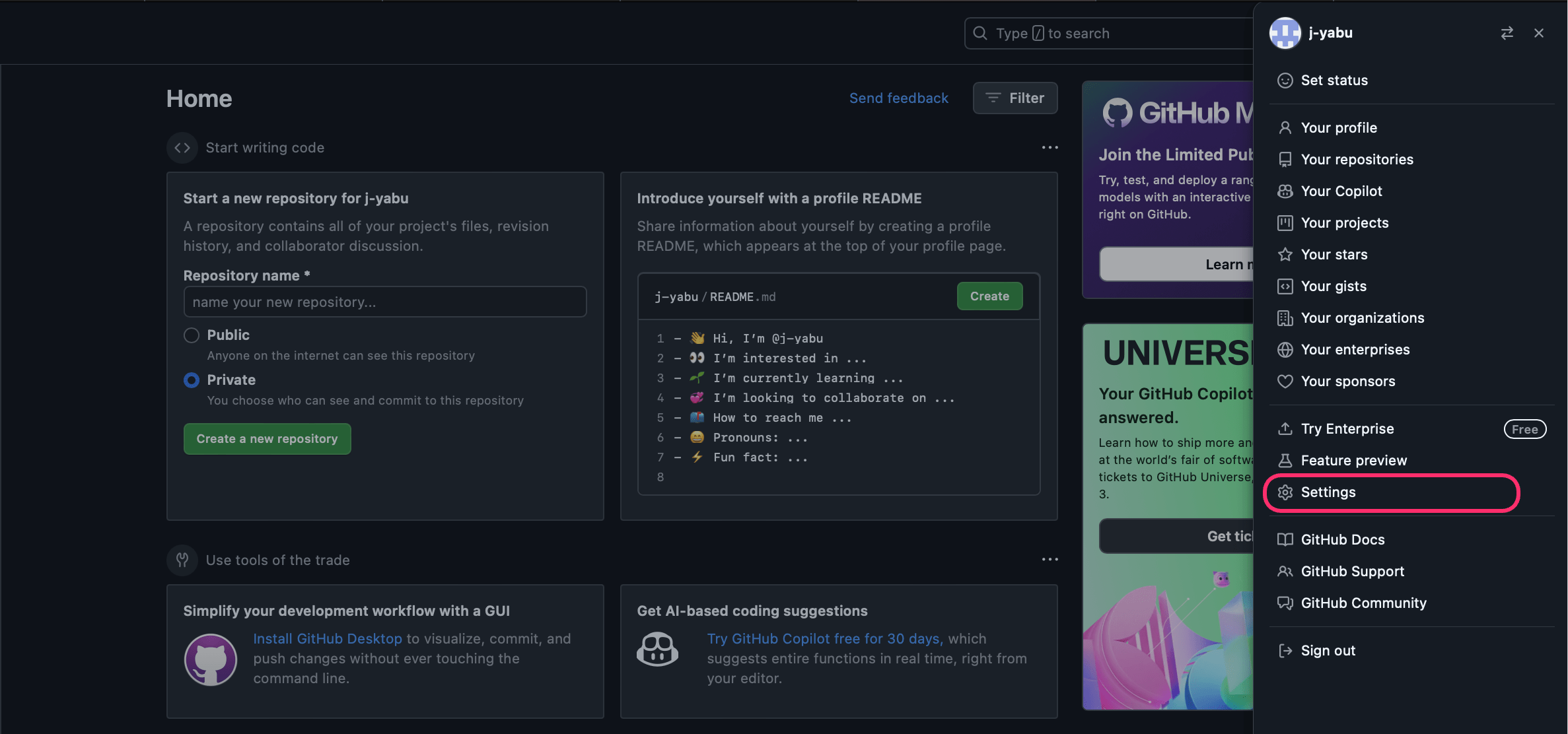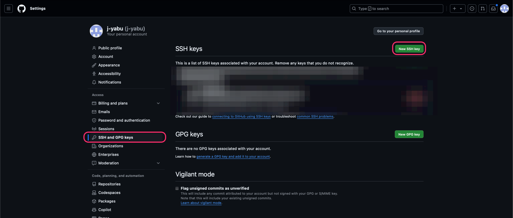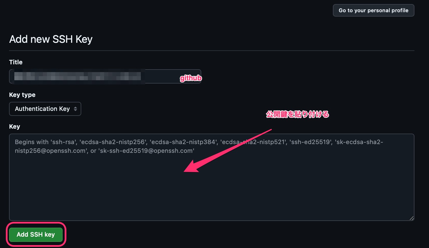 - GitHubへ移動し公開鍵を登録していく