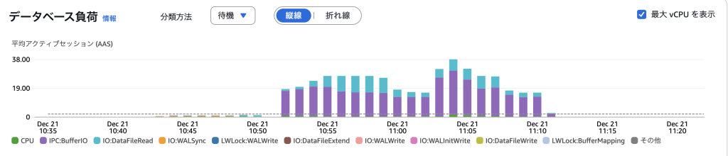 平均アクティブセッション (AAS)はCPUで実行中、待機中の処理の合計です。vCPU数(DBインスタンスのCPUコア数)との比較をしてCPUで実行できる量より、同時に実行中、待機中の処理数が多くないか確認します。