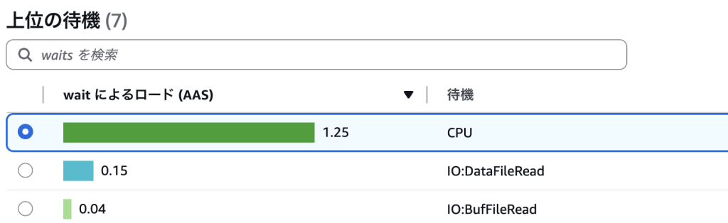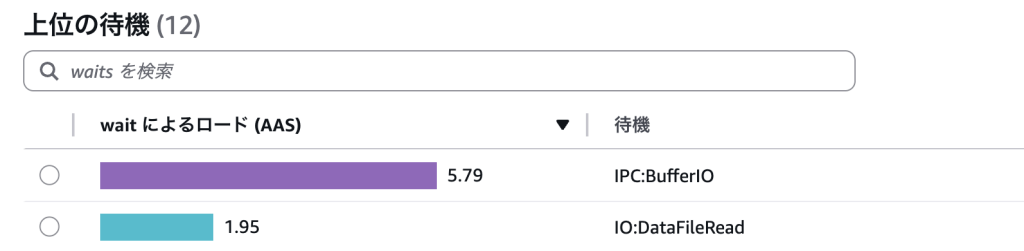 RDSのvCPU数が2(グラフだと点線)でASSが最大で38と大幅に超えていて負荷の高い状態なのがわかりました。次に「上位の待機」を確認して何が原因でASSが高くなっているかみてみます。「上位の待機」はDBの処理が何が原因で止まっているかをランキング表示したものです。