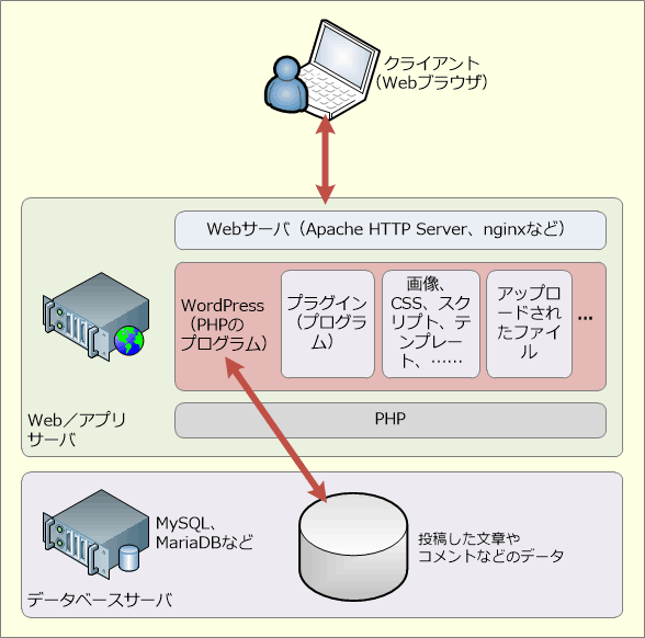だれでも簡単にブログやWebサイトの作成ができる「コンテンツマネジメントシステム(CMS)」の一つです。さらにオープンソースソフトウェア(OSS)でもありソースコードを無償で公開しています。誰でも自由に改変や再配布ができるソフトウェアとなります。WordPressはクライアントからのリクエストを受けるWebサーバ、動的な処理を担うアプリケーションサーバ、データを保存するデータベースサーバの三階層の設計となります。