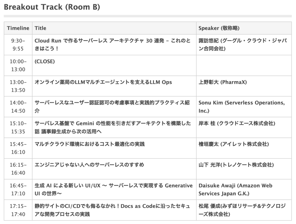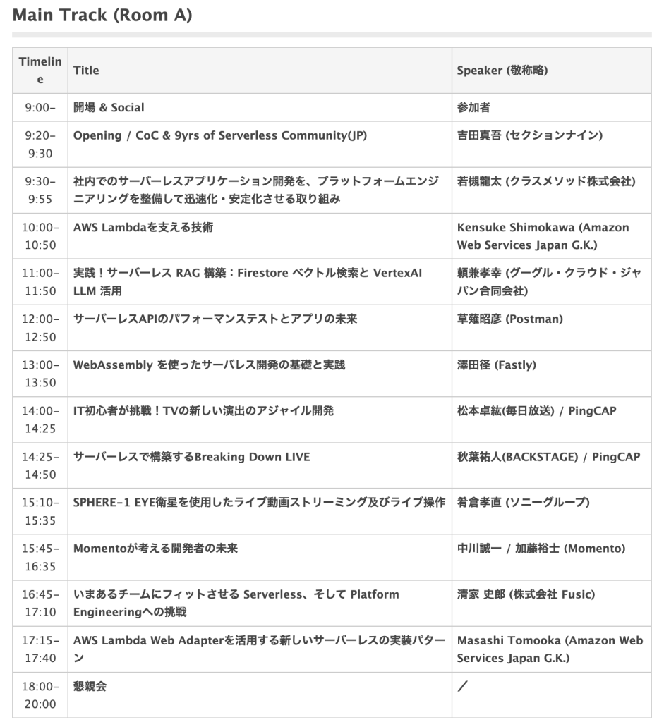 2024年の開催は9月21日から22日の2日間にわたり、1日目はテクノロジーカンファレンス、2日目はハンズオンワークショップという構成になっています。私はテクノロジーカンファレンスに参加しました。まだサーバーレス分野には詳しくないのですが、サーバーレスアーキテクチャに関する知識を深める良い機会だと思い、参加を決めました。